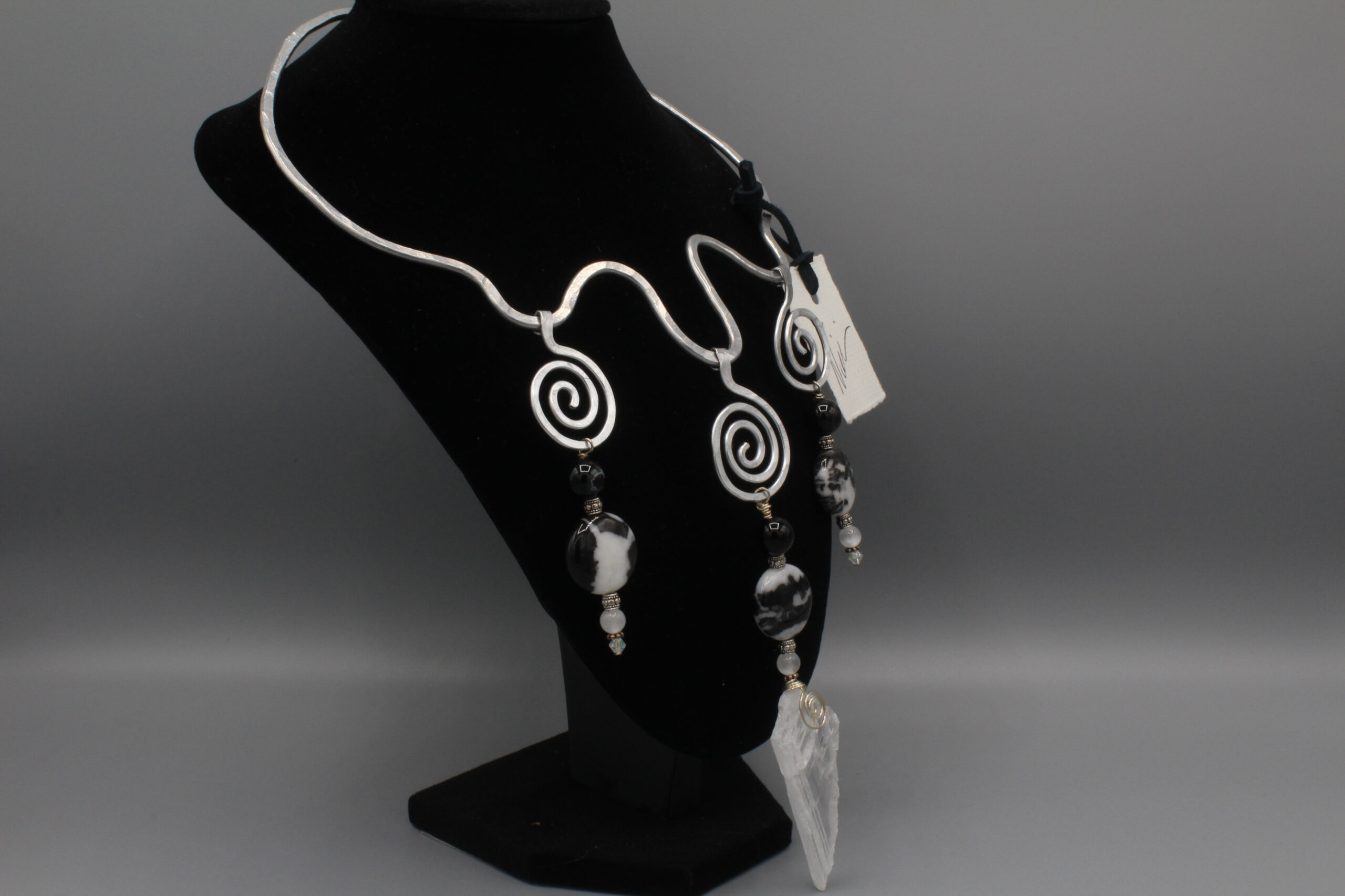 Rugged I am Neck Cuff (Zebra Jasper, Black Banded Agate, New Mexico Selenite): The profound concept of yin-yang is embodied in this wonderful piece as it visually emanates the balance of all things via the combination of the stones.